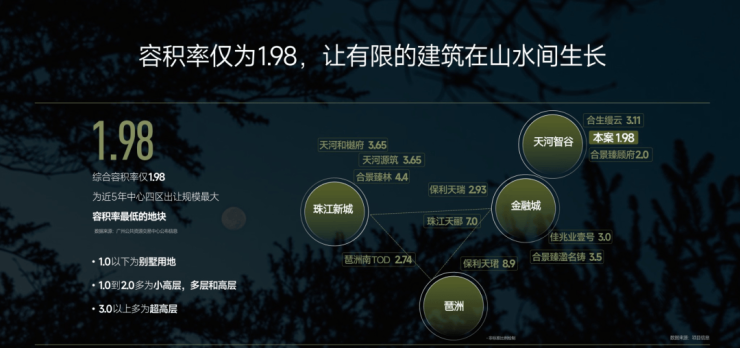 【樾·低密】天河难再有的低密住区,板块综合容积率仅1.04,让有限的建筑在山水间生长,项目容积率仅1.98,是近5年中心四区出让规模最大,容积率最低的地块,宛如在森林里种房子