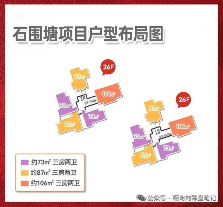 1、2栋户型分布一致,主打建面约73-87-106㎡三四房,总计250户。