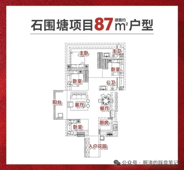 约87㎡则是4房2卫,但两个户型差距较大,其中一个是拥有独立玄关的竖厅。