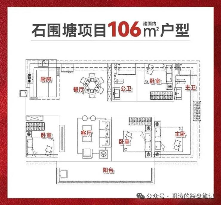 四房设计,南北对流,阳台约有7米,横跨客厅、卧室;每个房间也更加宽敞,居住舒适度相对更高。