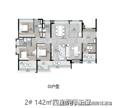 而140㎡与142㎡户型则在功能细节上进一步优化:前者采用洄游动线设计,双主卧布局适配多代共居;后者设置双阳台,分别承担观景与储物功能,实用性显著提升。