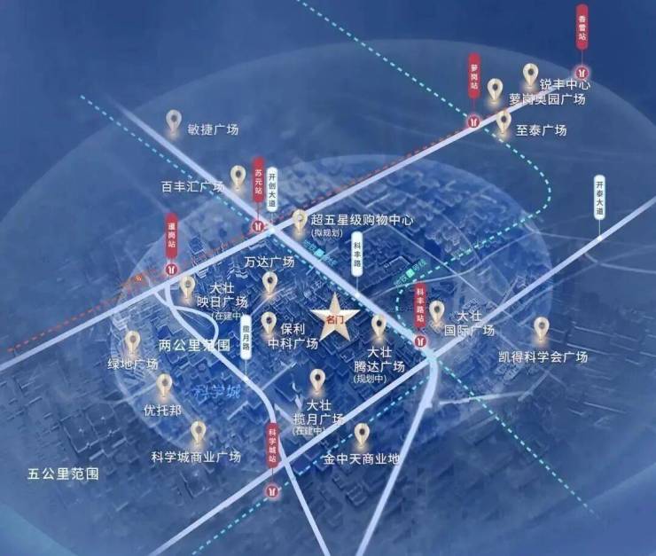 大壮名城·名门占据城市核心地段——科学城核“芯”黄金2公里(科丰路与开创大道的十字路口交汇处),集聚政务中心、商贸中心、发展中心于一体