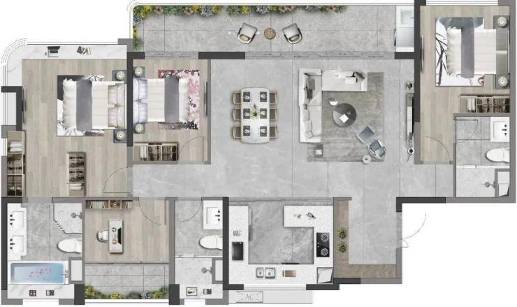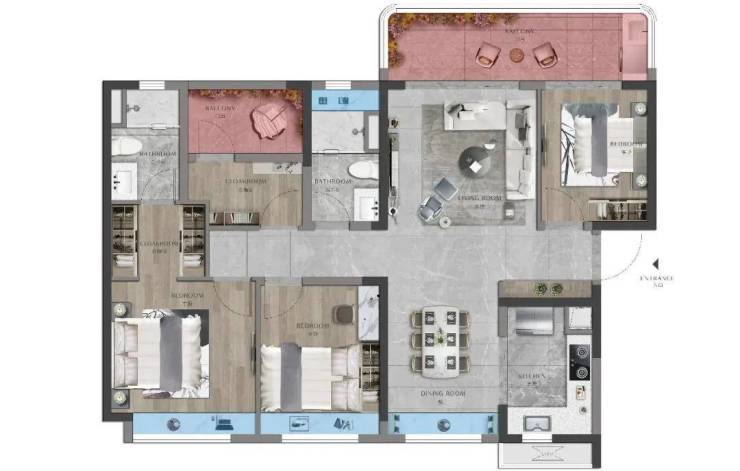东南向主卧开间达到3.5米,配有步入式衣帽间。次卧与景观阳台衔接,延展景观视野。