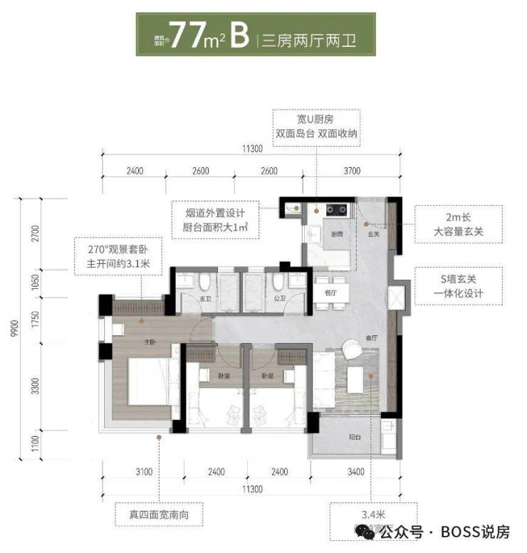 77㎡户型:次卧与客厅灵活可变,适合单身或新婚夫妻全周期需求