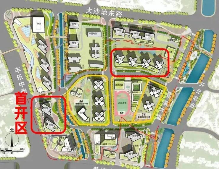 一共规划了7个地块,其中2个复建地块、2个融资地块、2个商业地块+1个学校地块。