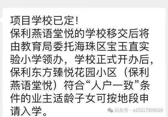 保利官宣了配建的24班小学,建好后将会移交将由教育局委托海珠区宝玉直实验小学领办,学校正式开办后,保利东方臻悦花园小区(保利燕语堂悅)符合“人户一致”条件的业主适龄子女可按地段申请入学。