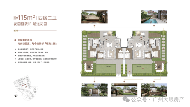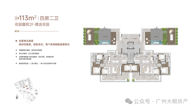 “玥境”为滨江小洋楼,主打112-130㎡低密叠院,最大亮点是超高赠送率,1F、2F户型赠送私属花园,3F赠送超大景观露台,4F复式设计,赠送顶层天台。