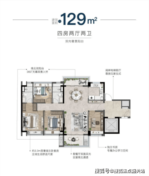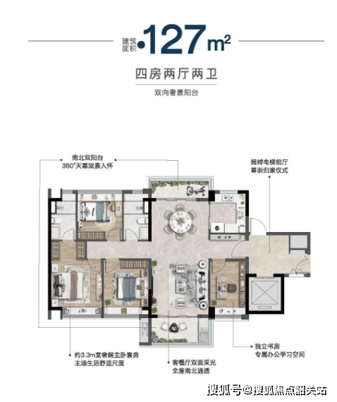 建面约104-120平方米四房两厅两卫:适合小家庭居住,南北通透,采光良好。