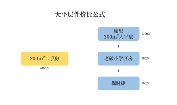 有个著名的大平层性价比公式,同样2000万,悦府的二手只能买200方,白鹅潭瑞玺却有300方,读书只要花200万买个老破小或者国际学校,省下来的钱还能买辆保时捷。