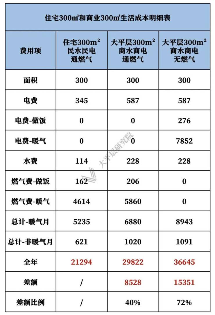 300方大平层的水电费比300方住宅一年贵了15000元,很有限,相比于住宅6折系数省下来的钱,都够用几百年水电物业了。而且还有燃气,除了产权不一样,居住体验跟住宅一样,甚至还要好。