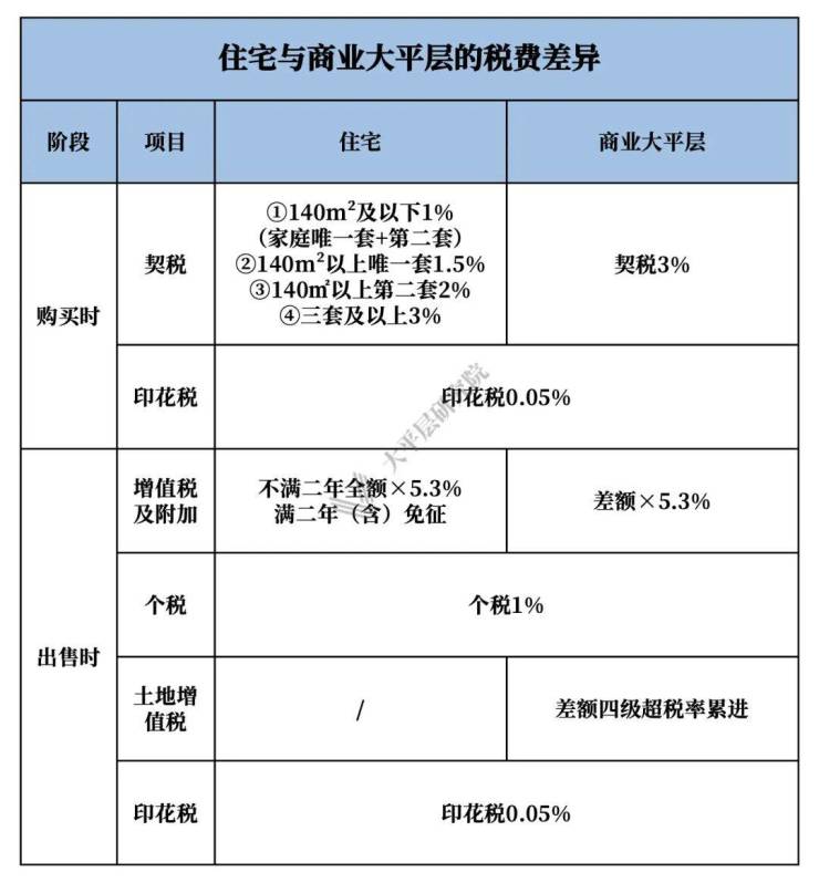 大平层购买时契税3%,印花税0.05%。出售时印花税0.05%、个税是差额×20%、增值税是差额×5.3%,土增税也是差额计算。因此不增值的话,差额为0,就不用交税。