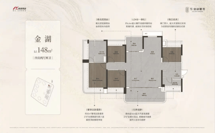 4:推出建面约98-148㎡全南向户型,主打刚改客群。户型设计合理,如98㎡户型采用LDKB一体化设计,实现餐、客、厨、阳多空间融通,预留可改造空间,最多可做到4房带主套;132-148㎡楼王户型配备270°弧形玻璃幕墙,视野开阔。