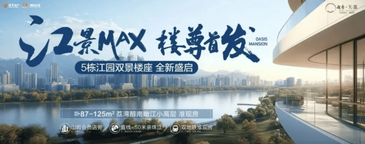 越秀天瀛,国企越秀匠心之作,踞荔湾珠江畔,享江园双景与低密舒适社区。交通多维,教育资源丰富,近太古里等高端配套,发展潜力大。建面约 87 - 125㎡高实用户型,总价 23X 万起,性价比高。适合注重生态的刚需、刚改家庭,广佛通勤族及看好区域发展的投资者。