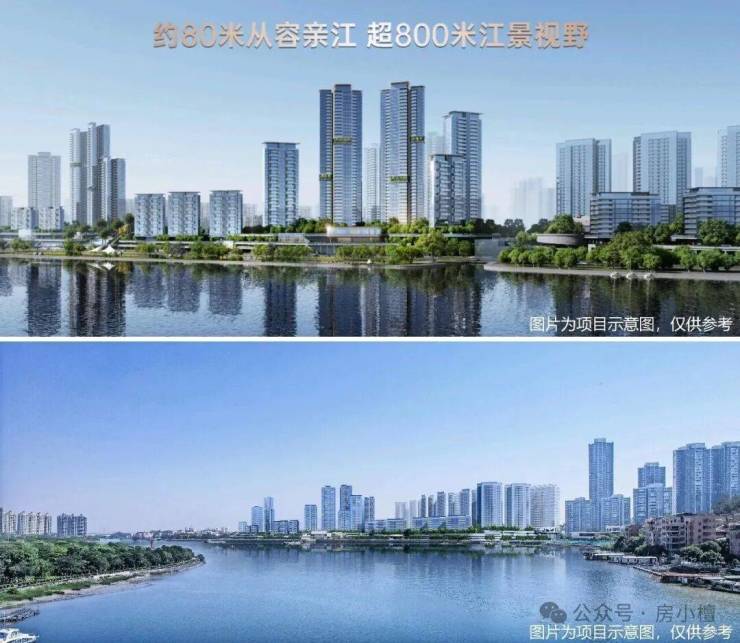 生态资源得天独厚,江玥上城距珠江最近仅60米,拥有约1000米江岸线,观江面宽度远超侨鑫汇悦台、天誉半岛。现行政策要求退江100-200米,项目约80米一线临江近乎绝版。