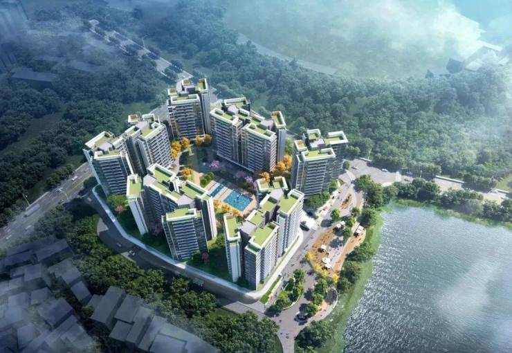项目整体采用围合式布局,这样将景观做到了整体性,把公共配套最大化,结合了山水环绕的优势,小区中间是园林和泳池,外面的几栋楼有一些角度便宜,采光视野更加开阔。
