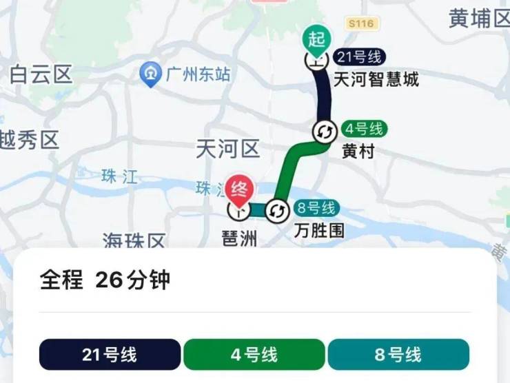 地铁去往琶洲:乘坐21号线到黄村换乘4号线,再到万胜围换乘8号线,需换乘2次,总6个站,地铁耗时26分钟,加上骑行至地铁口的时间,总耗时35分钟左右。