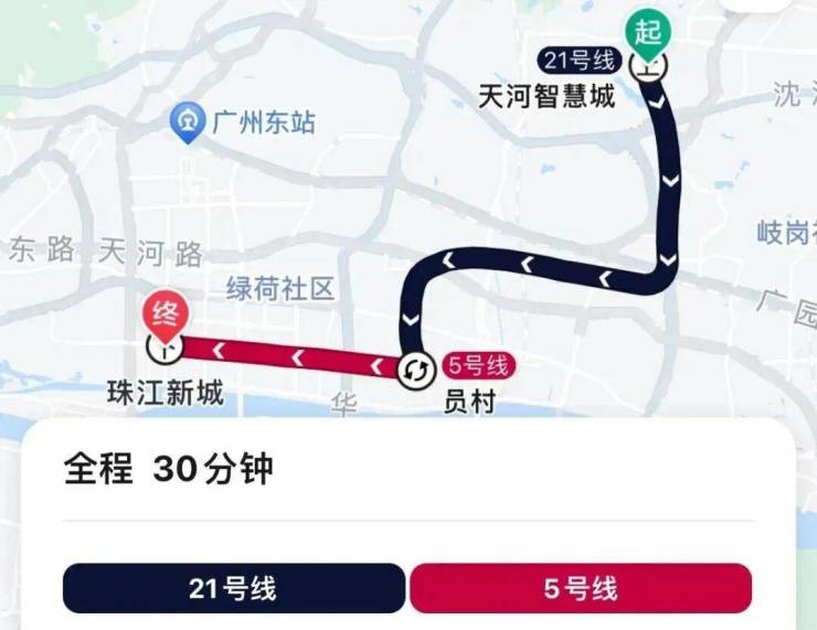 地铁去往珠江新城:小区骑行至地铁口,乘坐21号线到员村换乘5号线,再到珠江新城,全程8个站,地铁耗时30分钟,加上骑行时间总共39分钟左右。