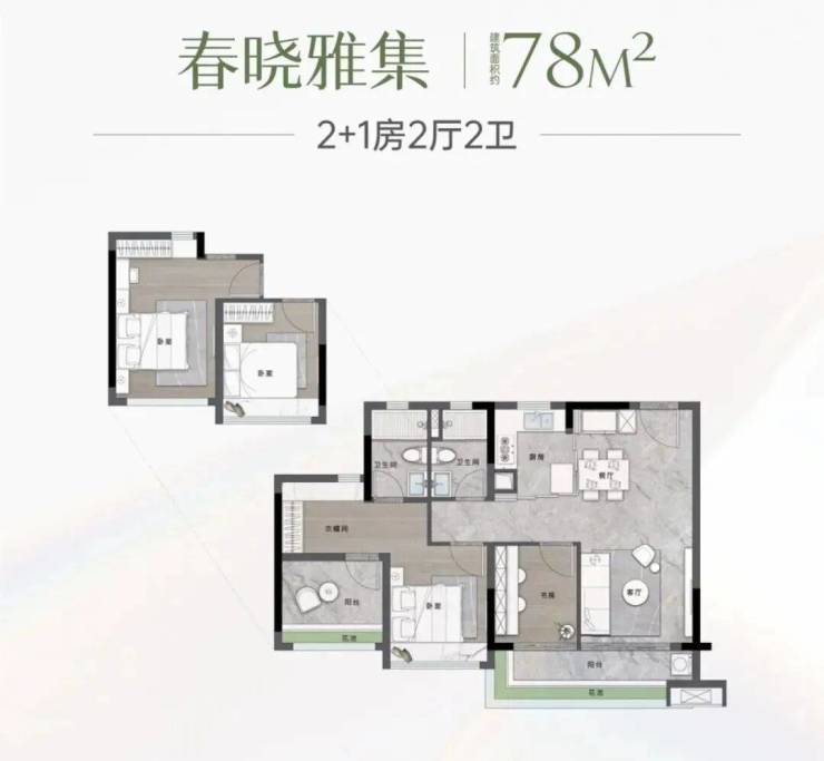 建面78平三房两卫,3房带主套,四开间采光,超长阳台贯通客厅与次卧,LDKB一体化设计,厨房采用玻璃推拉门半开放式设计,。