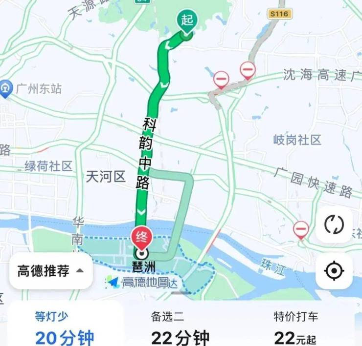 自驾去琶洲:同上,出小区走育新街然后转到科韵路,全程10公里,总耗时20分钟左右。