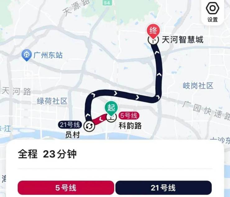 地铁去往金融城:从项目骑单车去地铁天河智慧城站,乘坐21号线到员村环城5号线,再到科韵路,全程6个站,地铁耗时23分钟,加上去地铁站的骑行时间,总耗时32分钟左右。