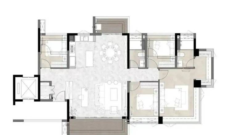 建面140平四房,全屋南北对流,双阳台设计,总共10个采光面,甚至做到了专梯专户,入户厅几乎独享。