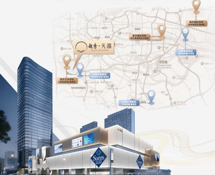 项目周边商业配套丰富多样,满足业主的各种生活需求。广州第三家山姆会员商店计划 2025 年开业,就位于项目旁,汇聚超 4000 种各类商品,可满足业主“一站式”购物需求。此外,项目周边还有省级文化航母“三馆合一”、广州第一家万象城等高端商业配套。省级文化航母“三馆合一”集文化、艺术、展览等多种功能于一体,为业主提供丰富的文化体验;广州第一家万象城则汇聚了众多国际一线品牌和特色餐饮,让业主在家门口就能享受国际化的购物和休闲体验。