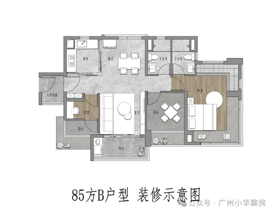 下面是85B的户型,阳台、卧室全南向三房,优越采光,四季阳光为伴