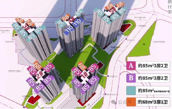 整体规划了5栋30-32层的住宅,围合式布局,产品涵盖68、85和110平的三至四房