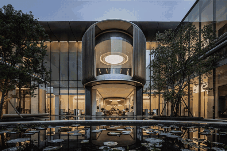 外立面是豪宅标配的玻璃幕墙+铝板,做了弧度,很有线条感。