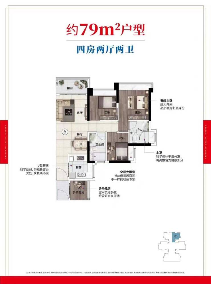 约79㎡全系带主套四房产品,是广州难得的极致户型,同等面积产品多一房一卫,全屋大飘窗提升空间的使用率,观景阳台为家中带来更好的采光和通风,U型厨房科学动线设计,烹饪轻松,活动空间更开阔。
