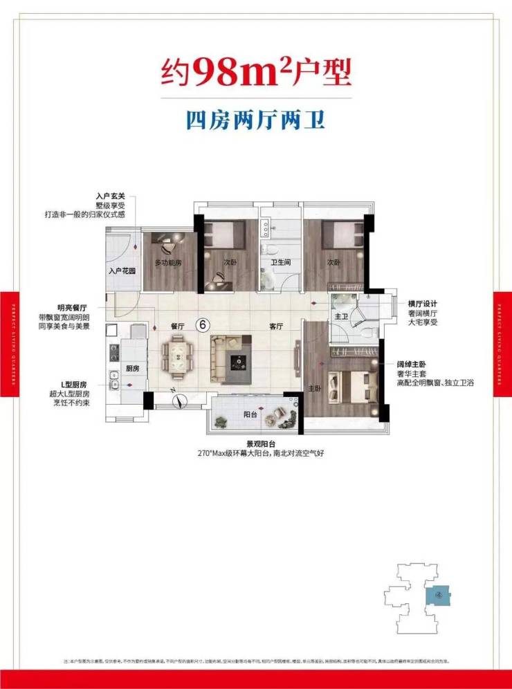 约98㎡四房户型相对适合预算比较宽裕的偏改善一族,6米大横厅设计,空间很大,户型也是很方正的一款。