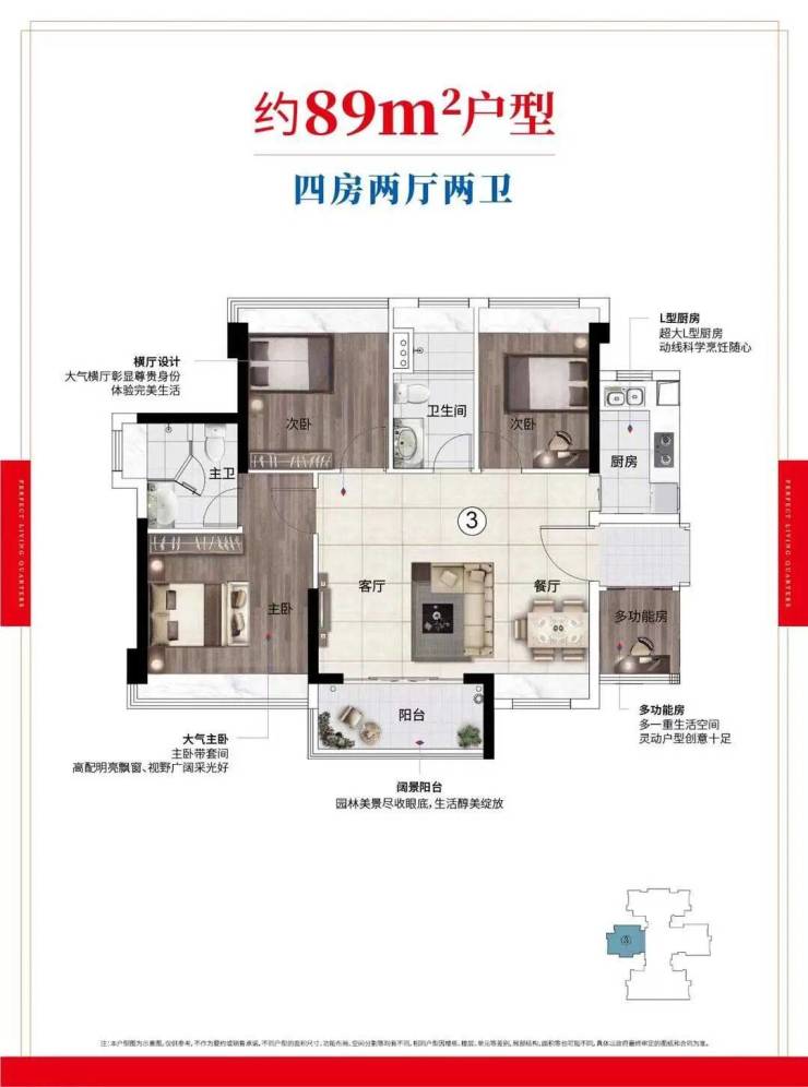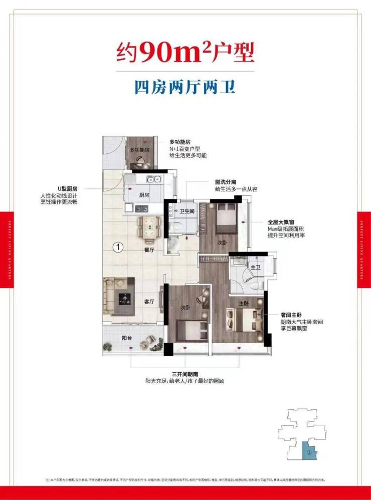 约89-90㎡全系带主套四房,三开间朝南,阳光充足;奢阔主卧带卫浴间,守护居者私密空间;N+1百变户型足以满足三代同堂的居住需求。