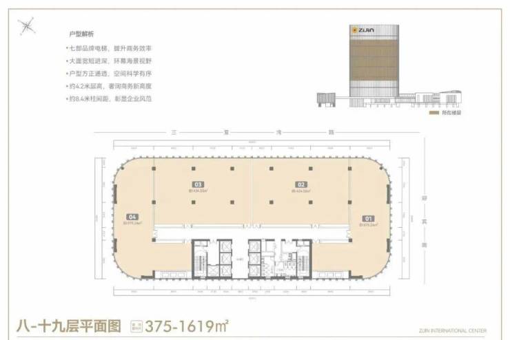建面约303-732㎡滨海创意空间,约4.5-5.4米阔绰层高,格局方正通透,可根据需求自由创享。建面约375-1619㎡ 云端总部办公,约4.2米奢阔层高,约8.4米柱间距,180°全海景视野。