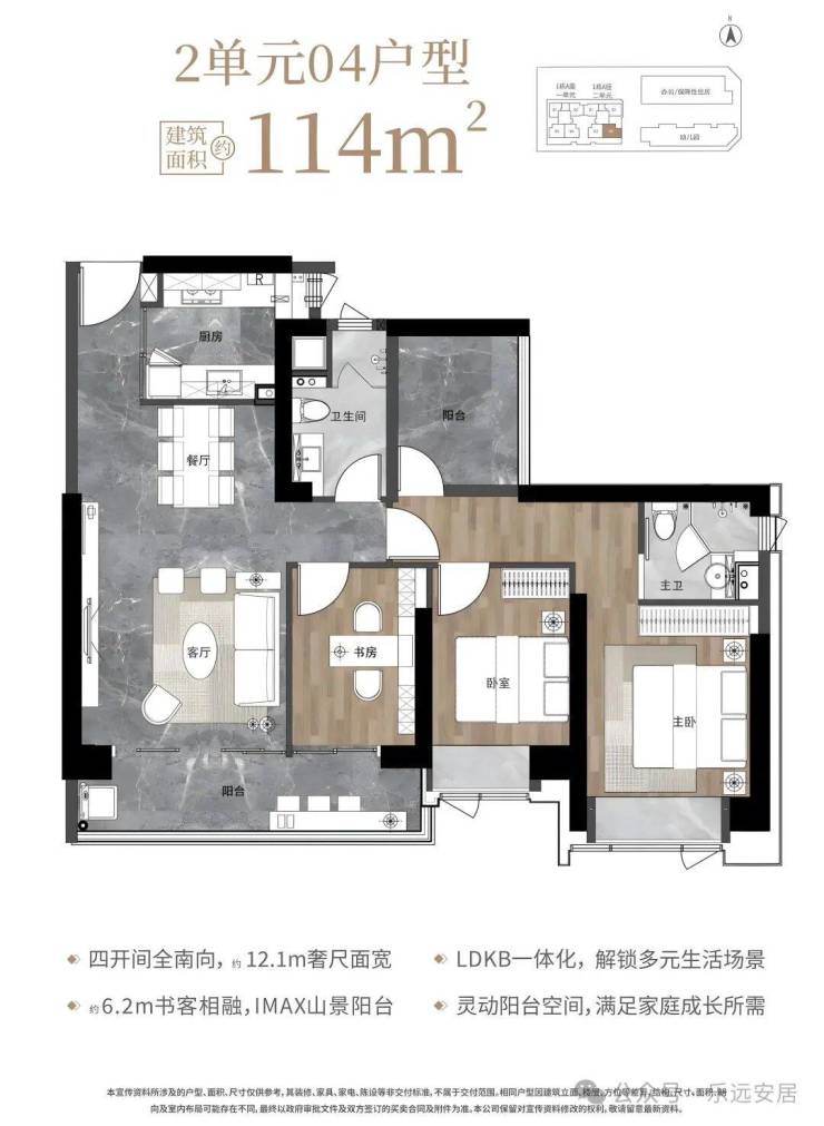114㎡的4房2厅2卫,1栋2单元04户型,设计的是经典竖厅格局,客厅3.85米开间,LDKB一体化设计,动静分区,四开间朝南,12.1米面宽,二字型厨房,卫生间干湿分离,客厅连接次卧出6.2米长大观景大阳台,正南朝向。