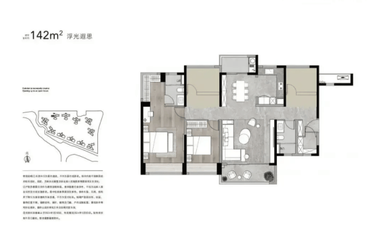 142㎡的 4 室 2 厅 2 卫空间更开阔,采用 U 型厨房设计