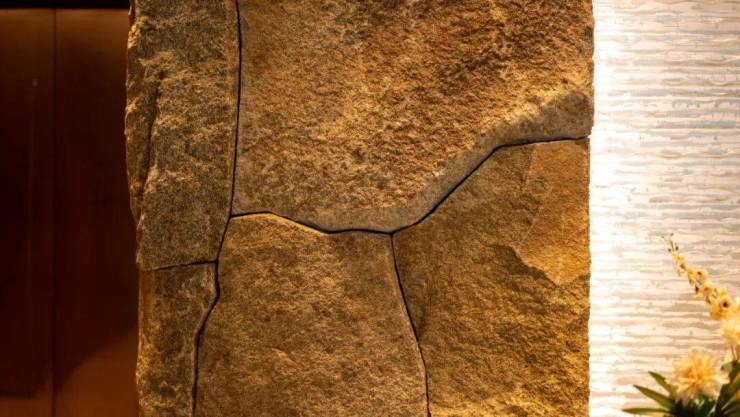 每栋建筑一楼,入户庭院两侧有整排石墙,大堂中央的庵治石更是直接到顶。