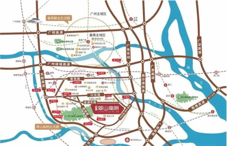 周边配套有番禺:荔园新天地、番禺奥园广场、番禺永旺梦乐城、基盛万科里、万达广场