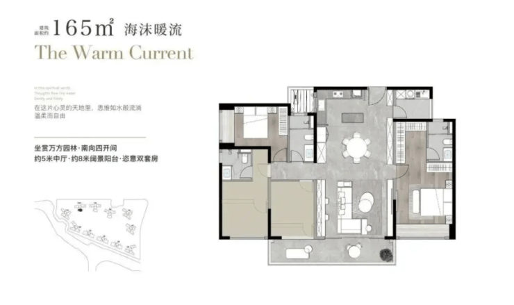 163-165㎡4室2厅3卫空间更开阔,动静分区清晰,主卧带独立卫浴,私密性好,适合改善家庭;