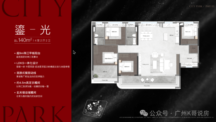 该栋为25层高,两梯三户设计,只有两个面积段,120㎡和140㎡,户型做得不错,在景观展现上用了功,极大程度去放大观江面,比方说超宽阳台、L型主卧转角飘窗、客厅预留观景飘窗等等,主打改善户型,2025年9月整体交房。
