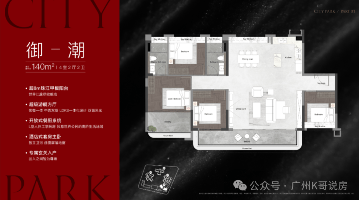 西派粤府采用围合式布局,前后有高度错位,能保障大部分户型能够看到旁边的江景。