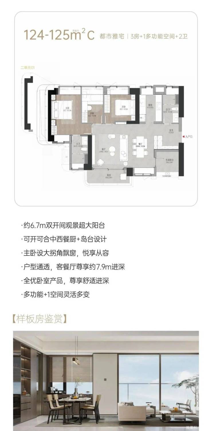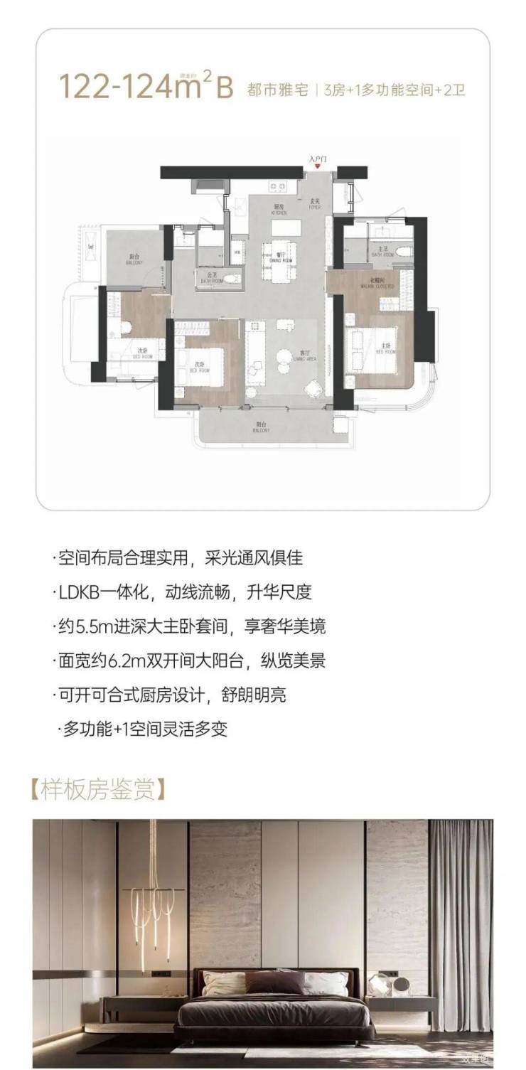 122-124㎡的4房2厅2卫,04/05户型,设计的是竖厅格局,客厅3.8米开间,LDKB一体化设计,三开间朝南,动静分区,分别做到了主卧13.78m²/次卧9.07m²/次卧8.1m²/次卧4.23m²(实测面积,去掉墙体),客厅连接次卧出6.7米长的观景大阳台,中西餐厨+岛台设计,公卫三段式干湿分离,得房率约71.7%(不含赠送),套内面积88.28m²,西南朝向。