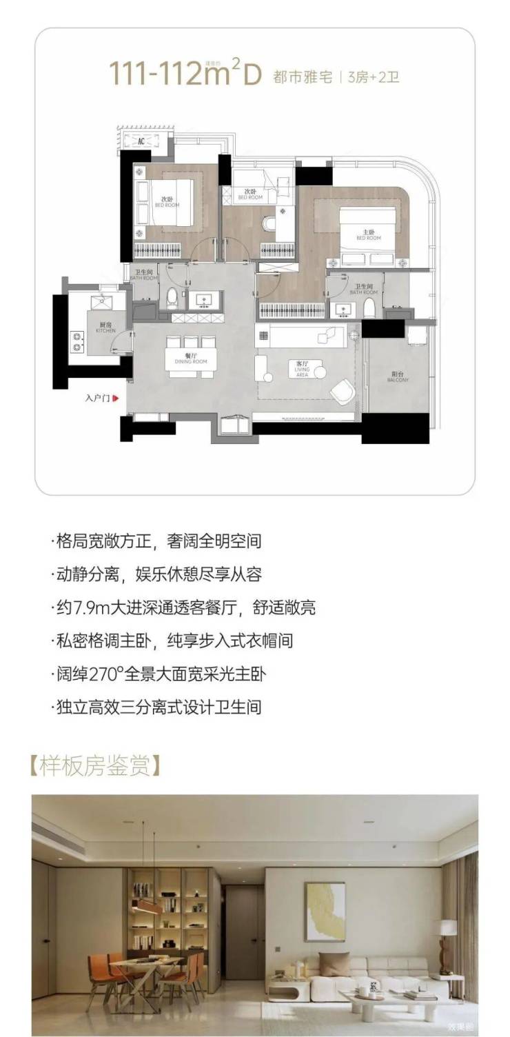 111-112㎡的3房2厅2卫,设计的是竖厅格局,客厅3.45米开间,LDKB一体化,S墙设计预留冰箱卡槽位,三开间朝南,动静分区,主卧270°全景大面宽采光主卧,分别做到了主卧13.1m²/次卧9.73m²/次卧7.02m²(实测面积,去掉墙体),U型厨房,公卫三段式干湿分离,得房率约71.7%(不含赠送),套内面积79.99m²,东南朝向。