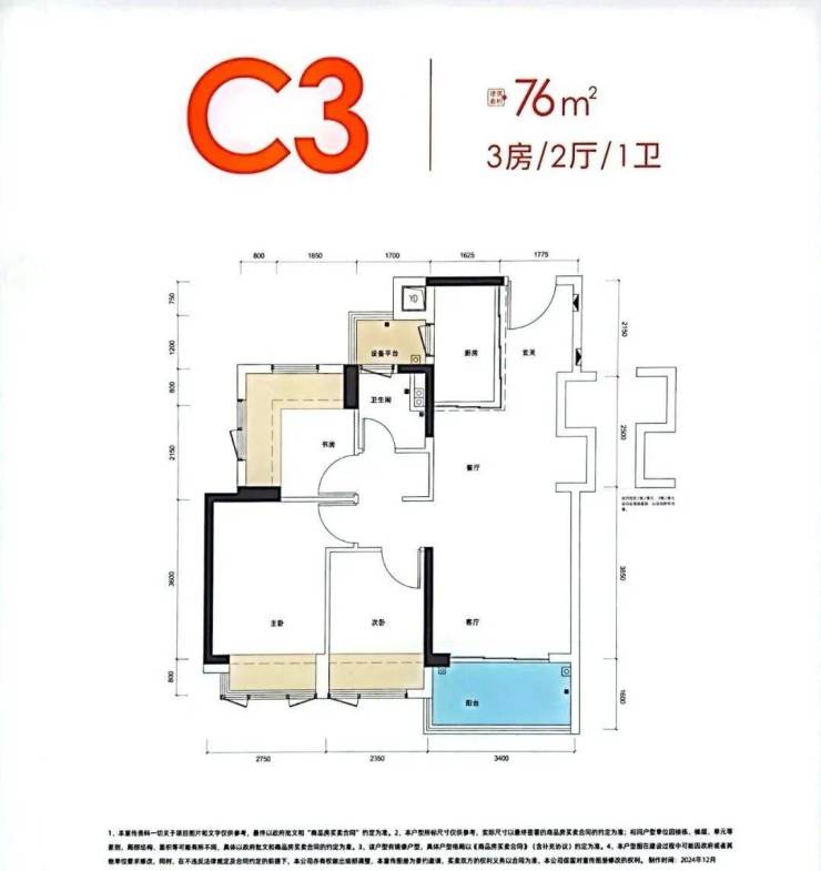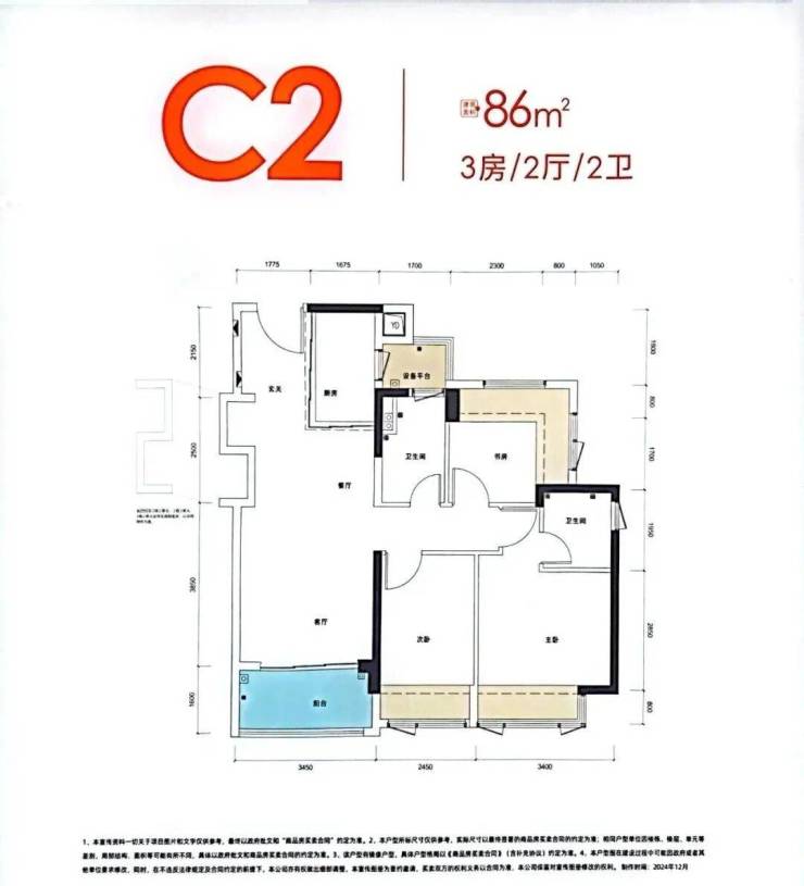 实得率高达约98%,尺寸能与新规前85-90平三房户型媲美。LDK一体化设计让客餐厨融为一体,约3.4米的开间让生活空间更显阔绰。所有卧室都额外赠送进深约0.8m的飘窗(远超市场0.6米标准),厨房外设有一个面积约2㎡的设备平台,这些赠送空间往往给生活带来意想不到的便利。