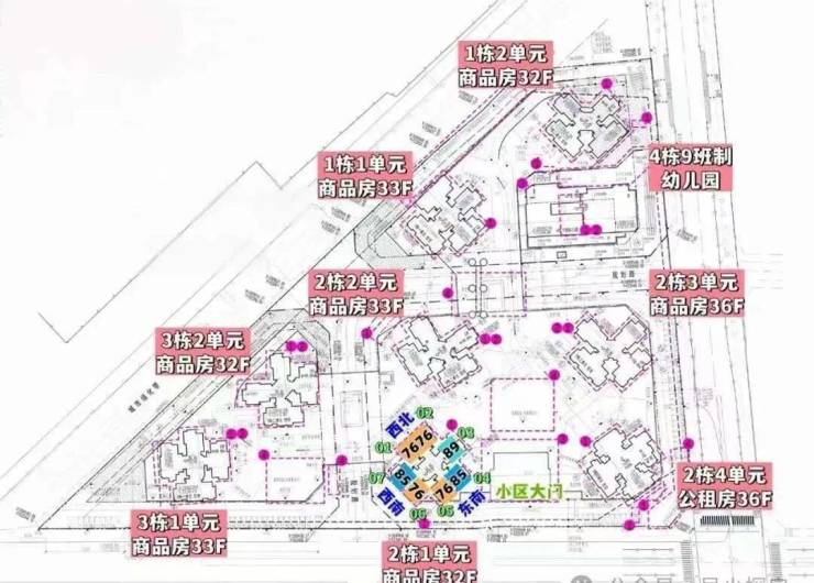 天健瑞云府,由天健集团+深福保+深高新集团3家国企联合打造,总占地面积约3.6万㎡,总建筑面积约22.49万㎡,计容建筑面积约16.46万㎡,容积率4.75,绿化率30%,共由8栋32-36层高住宅组成,分3个地块开发,不过花园都是共享连通在一起的,其中1栋1单元/2栋2单元/3栋1单元住宅33F,1栋2单元/2栋1单元/3栋2单元住宅32F,2栋3单元/2栋4单元住宅36层,4栋是1所9班制幼儿园。