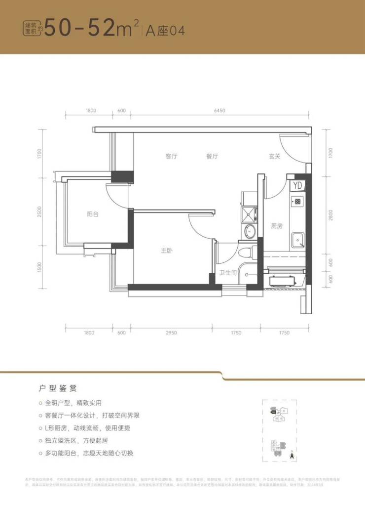 建面约50㎡上车小户(可售169套),全明户型,客厅带飘窗,三分离卫浴,无过道零空间浪费。
