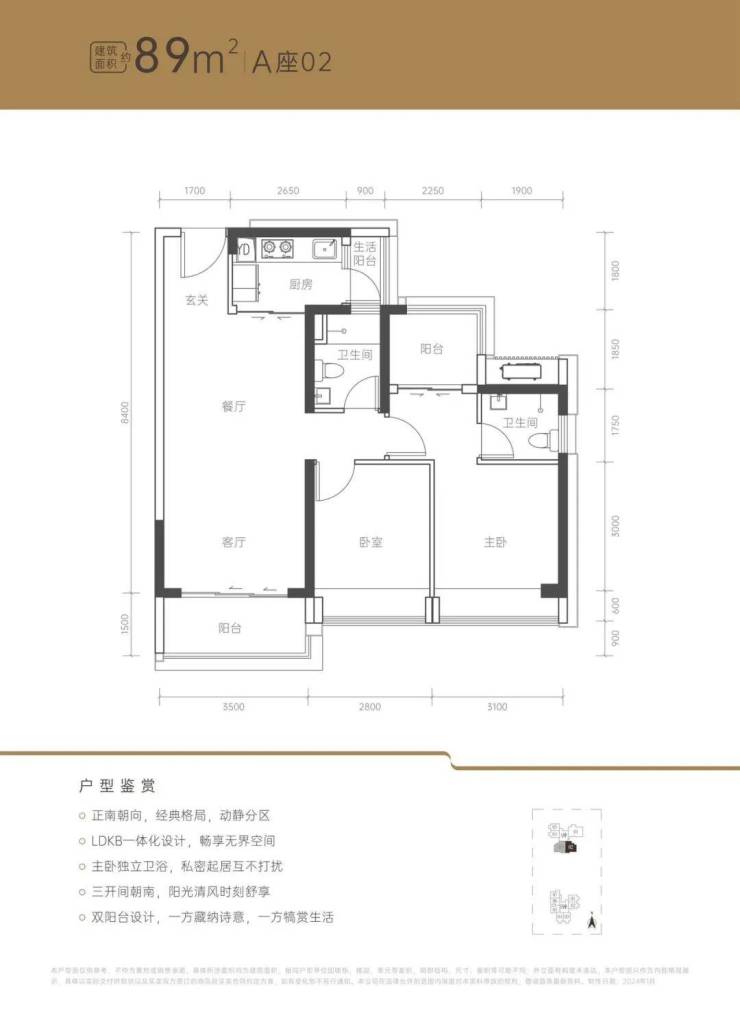 建面约89㎡正南户型(可售54套),三开间正南朝向,LDKB一体化设计,动静分区。