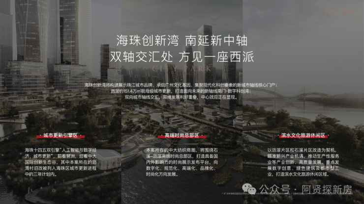 项目位于广州城市新中轴,贯穿天河北、珠江新城、广州塔,落点新中轴最后一公里,汇聚全城资源利好;同时作为广州城市南门户,迎接来自湾区乃至世界宾客,打造具有标志性、未来感、烟火气世界一流城市门厅。