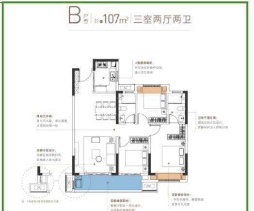 建面约107㎡三房两卫:堪称小户型中的“全能选手”。客厅开间达3.8米,连接近6.8米的L型阳台,采光通风极佳;三房布局合理,主卧带飘窗,厨房操作动线流畅,两个卫生间避免早晚高峰“抢厕所”的尴尬。得房率接近88%,在同价位产品中非常能打。
