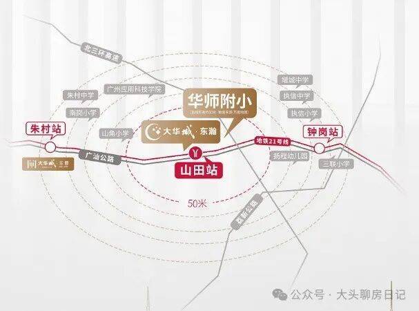 大华城——涵盖大华朱村中心城市地标(规划中)、地铁、教育、产业、商业、生态各项配套,名副其实的一生大城,未来容纳广州东约 30 万人口繁华居住地。