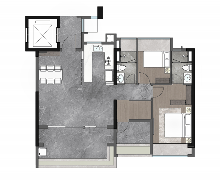 :约44㎡LDKG大方厅,U型厨房+岛式西厨,主卧配豪华衣帽间和270°转角飘窗。